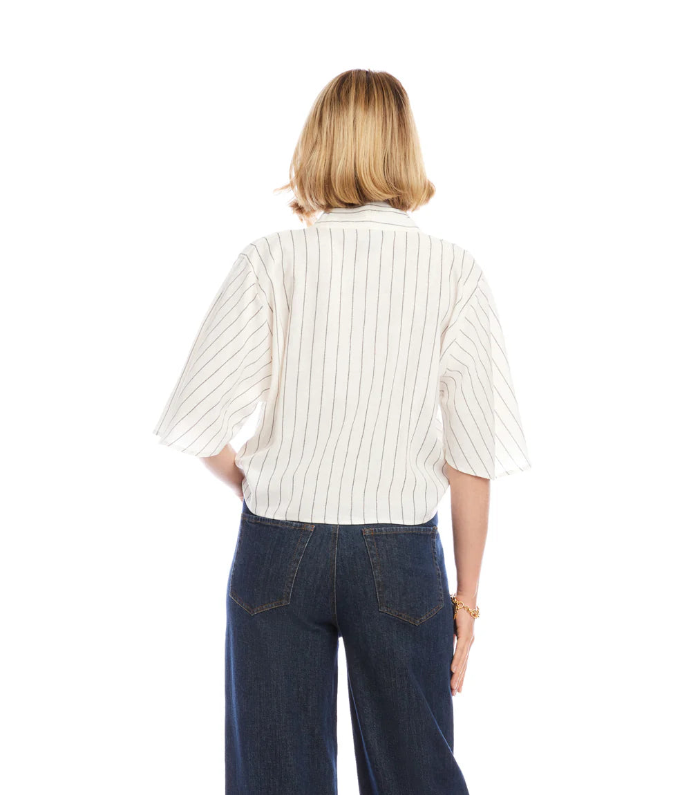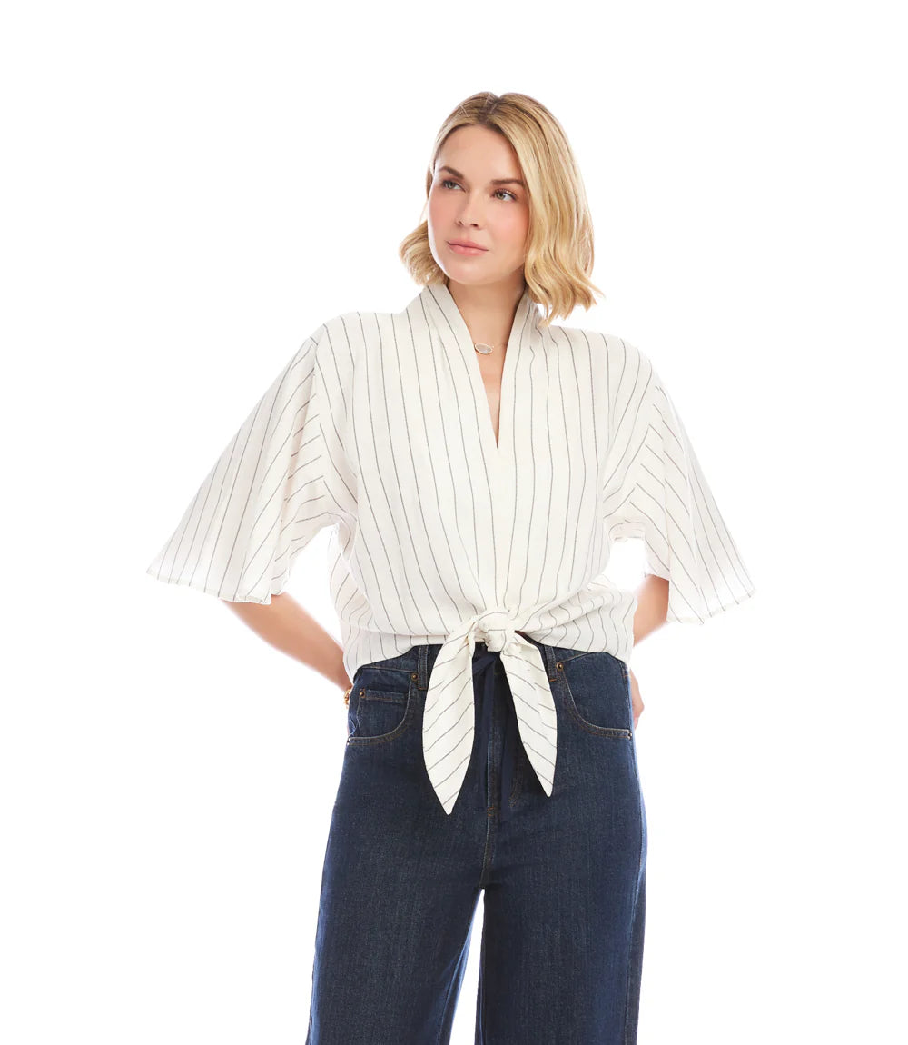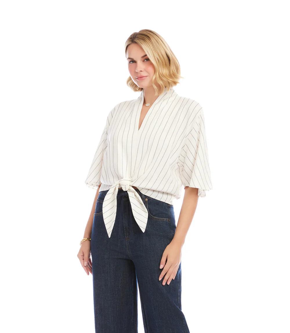 Linen Blend Stripe Flare Sleeve Tie-Front Top~ Cream & Black