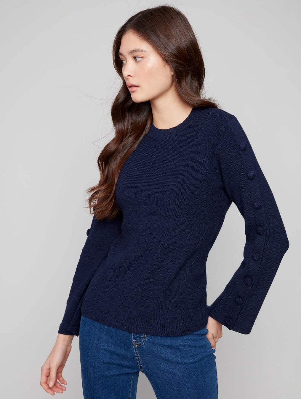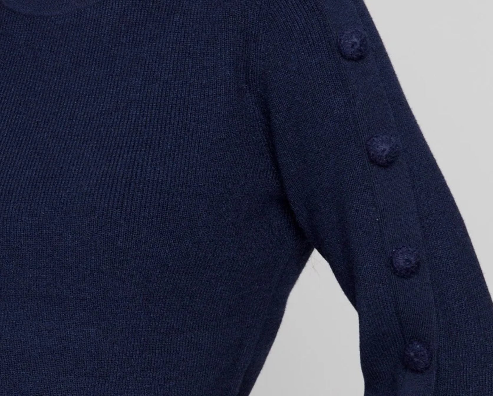 Upgrade your fall-winter wardrobe with this navy blue sweater, designed with a ribbed crew neck and knit button accents. Perfect for both casual and refined looks, it adds a distinctive touch to any outfit. Its soft, ribbed texture and unique sleeve buttons ensure comfort without compromising style, ideal for cozy, chic days ahead.