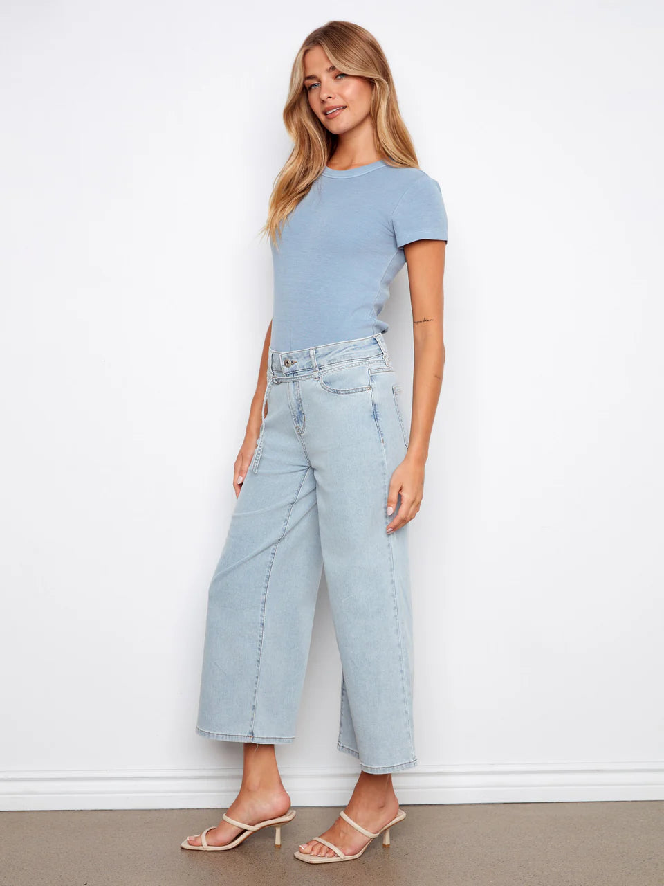 Discover the perfect warm-weather staple with these belted cropped wide-leg jean in a bleach blue shade. Made from soft denim fabric, they offer a comfortable fit with an easy, flattering shape. Finished with a classic button closure and a waist-defining belt, they’re ideal for everyday styling. Pair them with your favorite top for a relaxed look that feels as good as it looks.