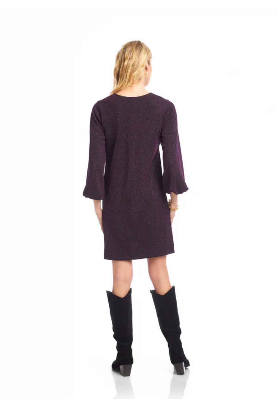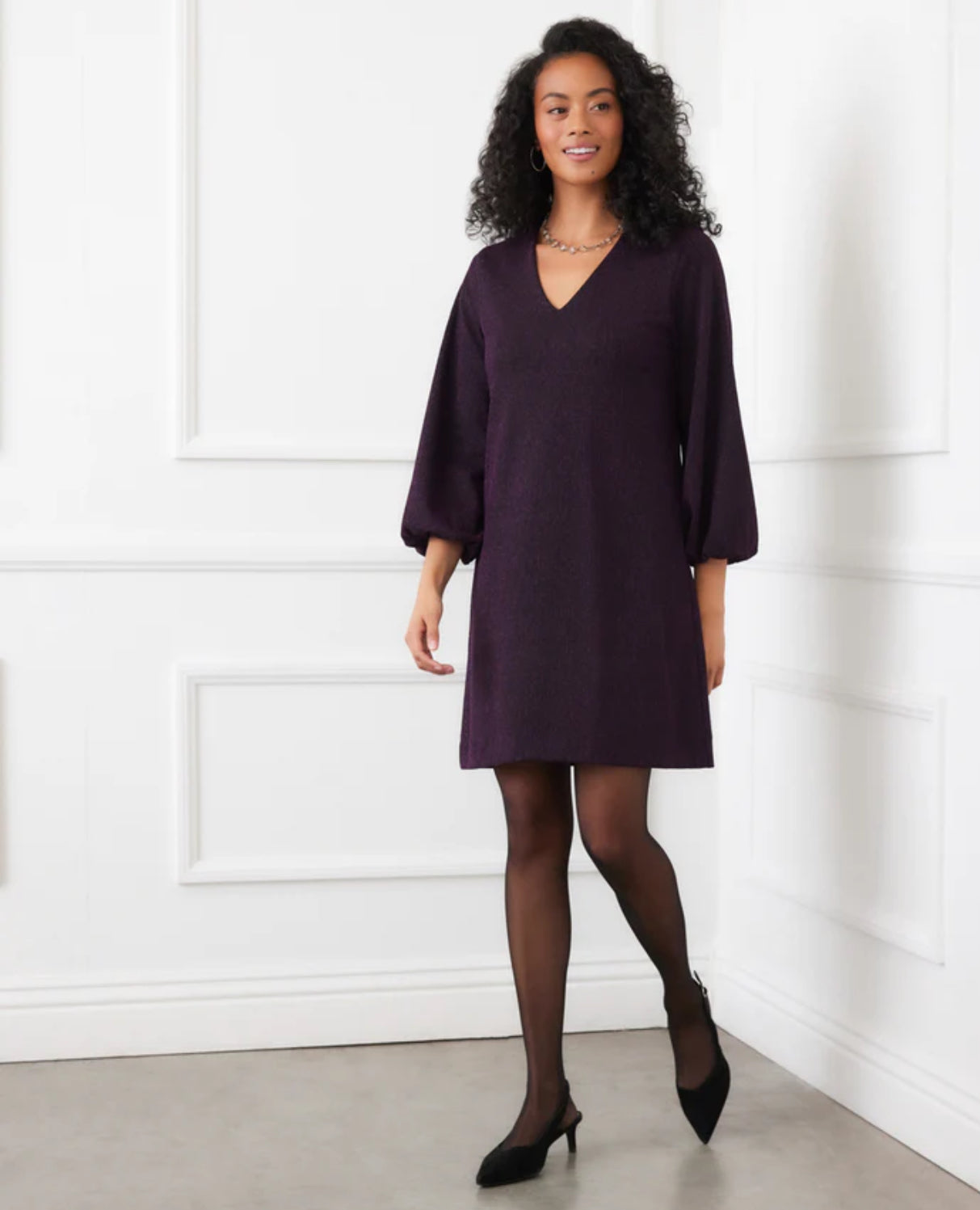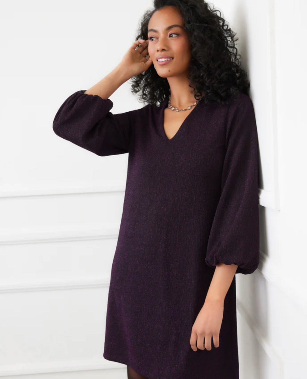 Shine with understated elegance in this long sleeve dress, crafted from shimmering metallic knit fabric. Designed with a flattering V-neckline and soft blouson sleeves, it falls into a relaxed A-line silhouette for a chic yet comfortable look. Lined for added comfort and coverage, it’s perfect for effortlessly transitioning from day to night.