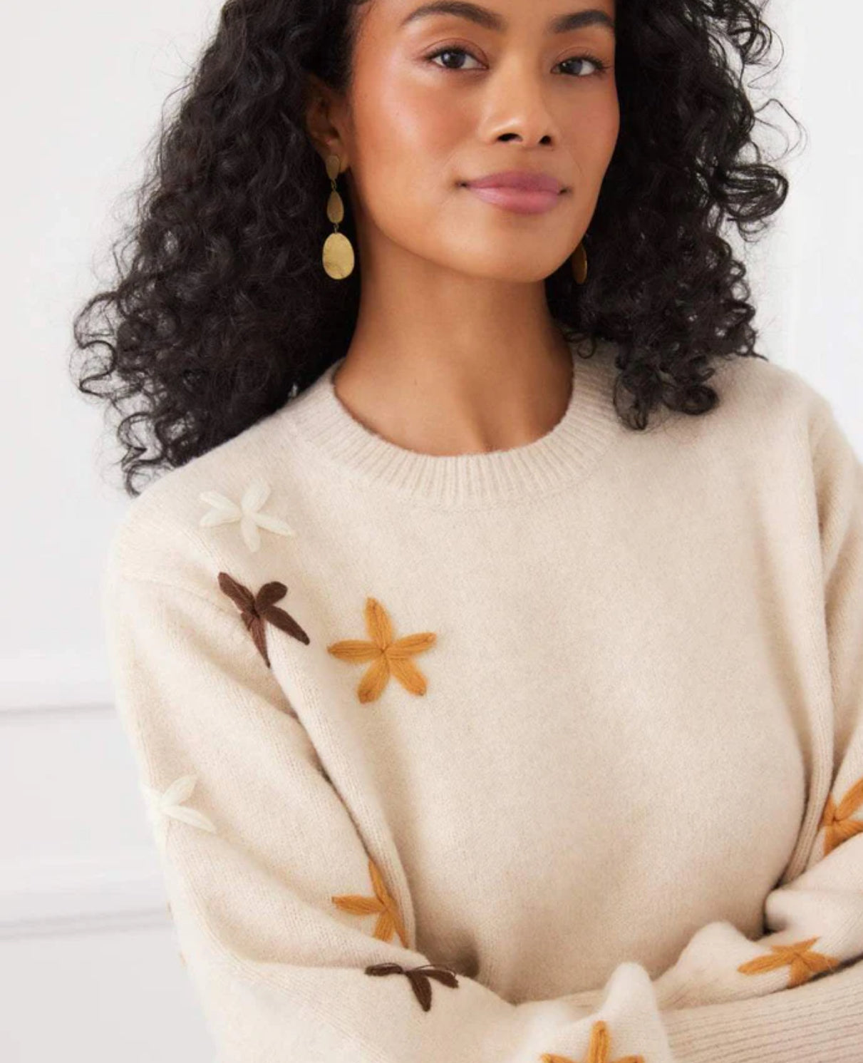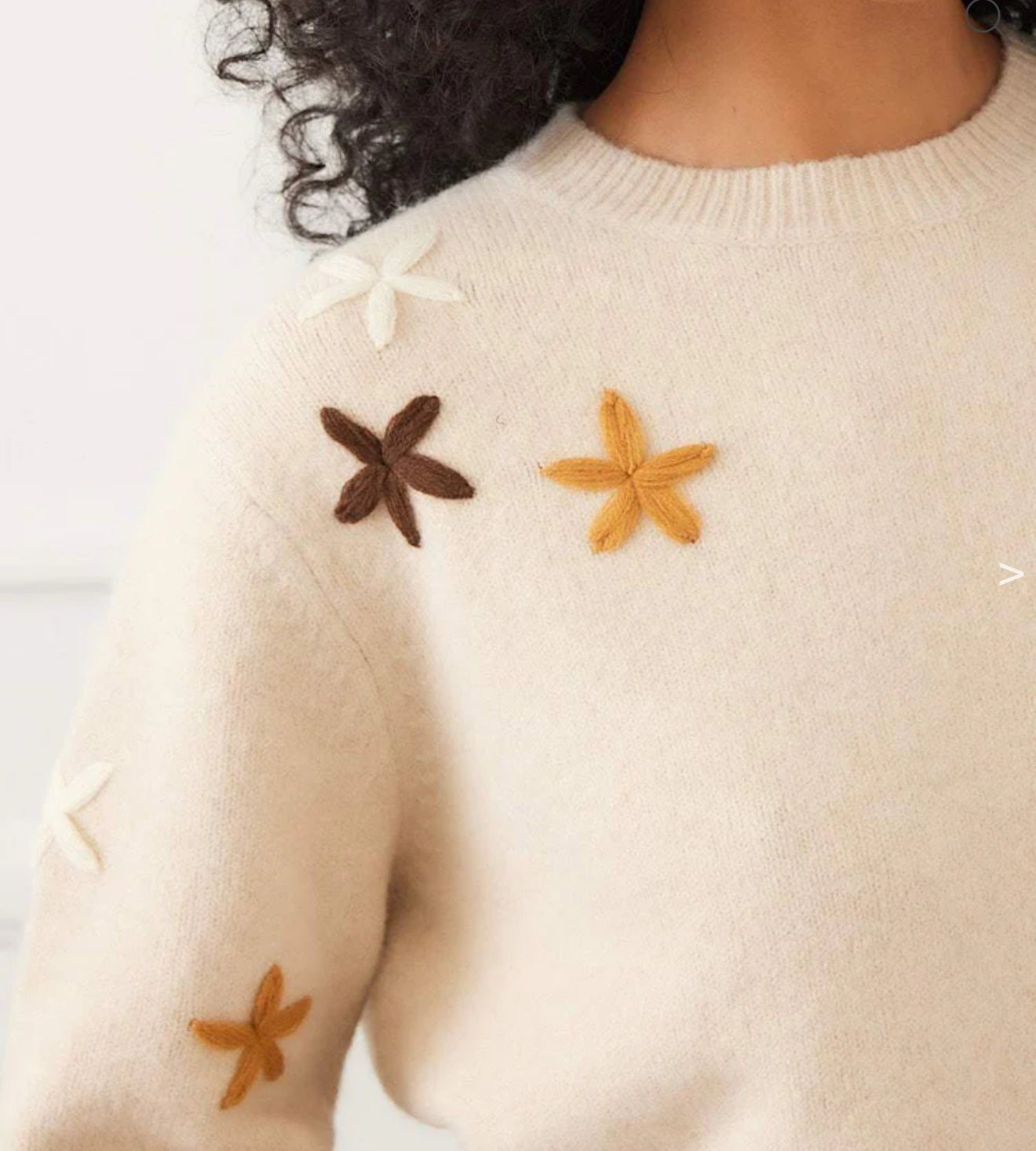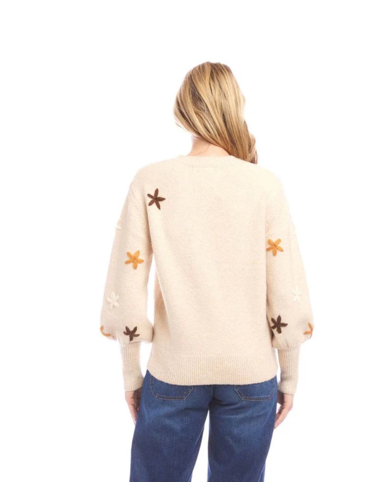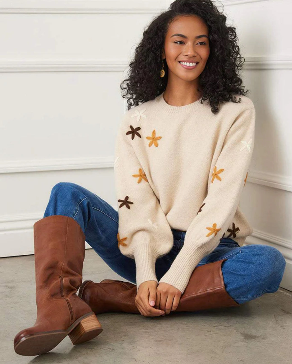 This cozy sweater features playful, multicolor embroidered flowers scattered along the long, extended sleeves. Designed with a classic crew neckline and finished with ribbed edge detailing at the cuffs and hem, it’s the perfect blend of cheerful charm and everyday comfort.