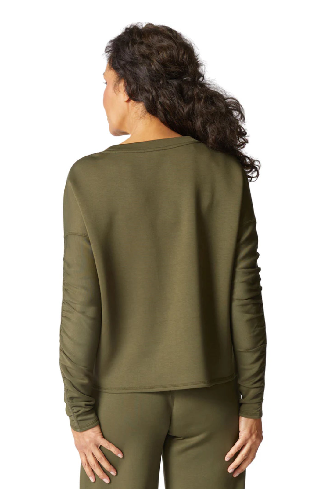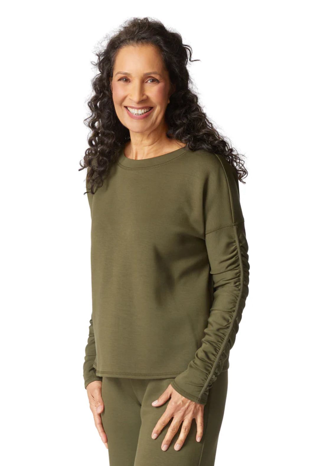 A sleek, travel-ready pullover with artistic edge. Crafted from smooth, luxe knit jersey in deep forest green, it blends modern tailoring with thoughtful details. Long sleeves feature dramatic ruching accented with twill tape, while dropped shoulders and exposed seams add subtle architectural interest. The boxy cut hem that falls at the hip makes it effortlessly comfortable for exploring or layering on the go, making this piece as versatile as your itinerary.