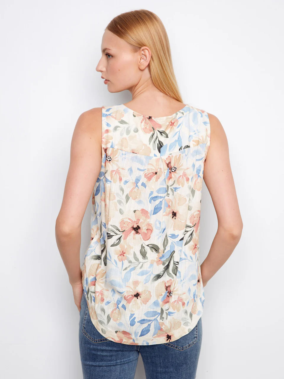 Refresh your collection with our sleeveless linen blend blouse, blending style and comfort seamlessly. Featuring the captivating Aurelia floral print, this piece stands out with effortless charm. The scoop neckline and rounded hem offer a chic, flattering look ideal for pairing with jeans or skirts. Embrace the warm days with this sophisticated yet easy-going essential.