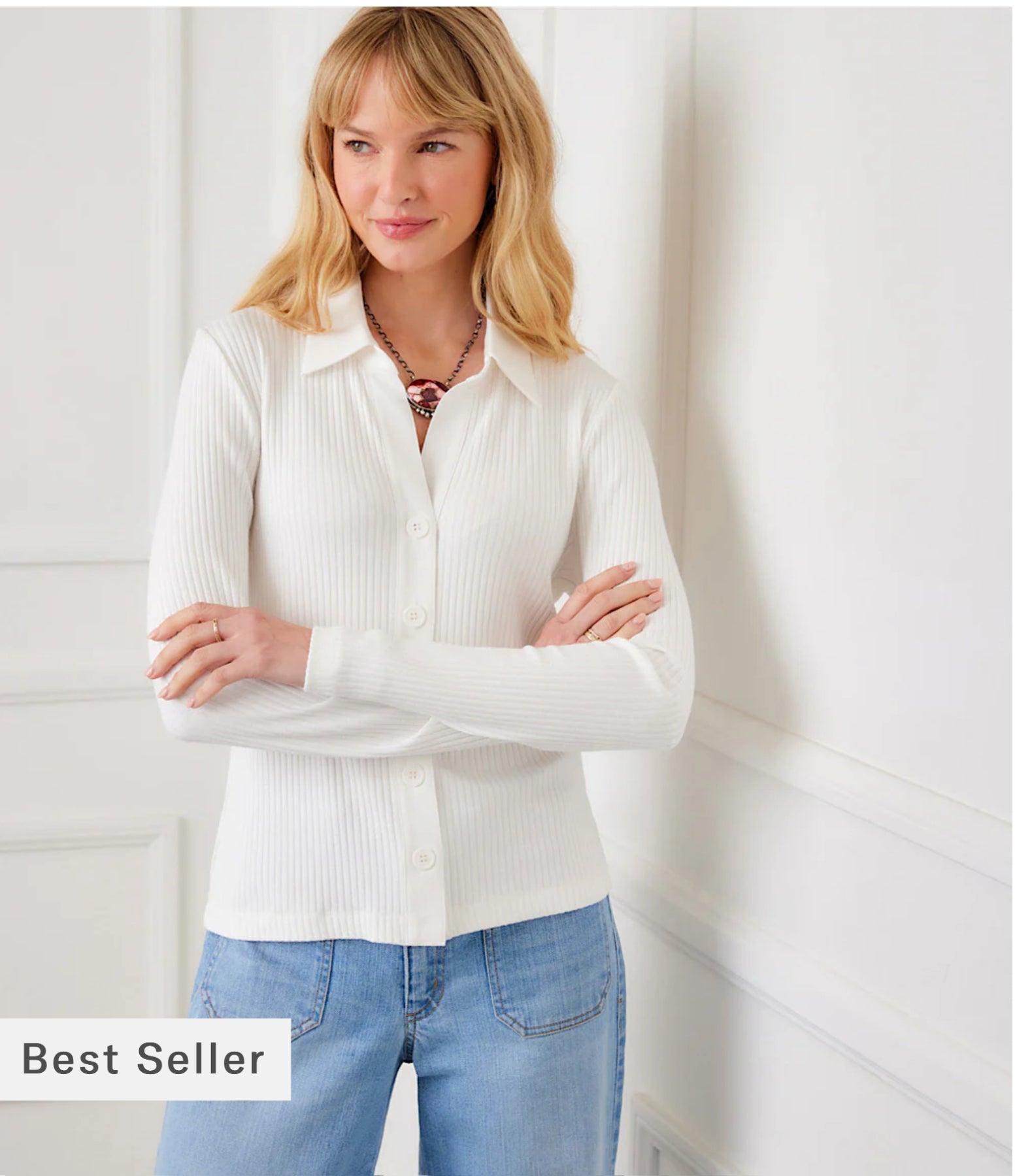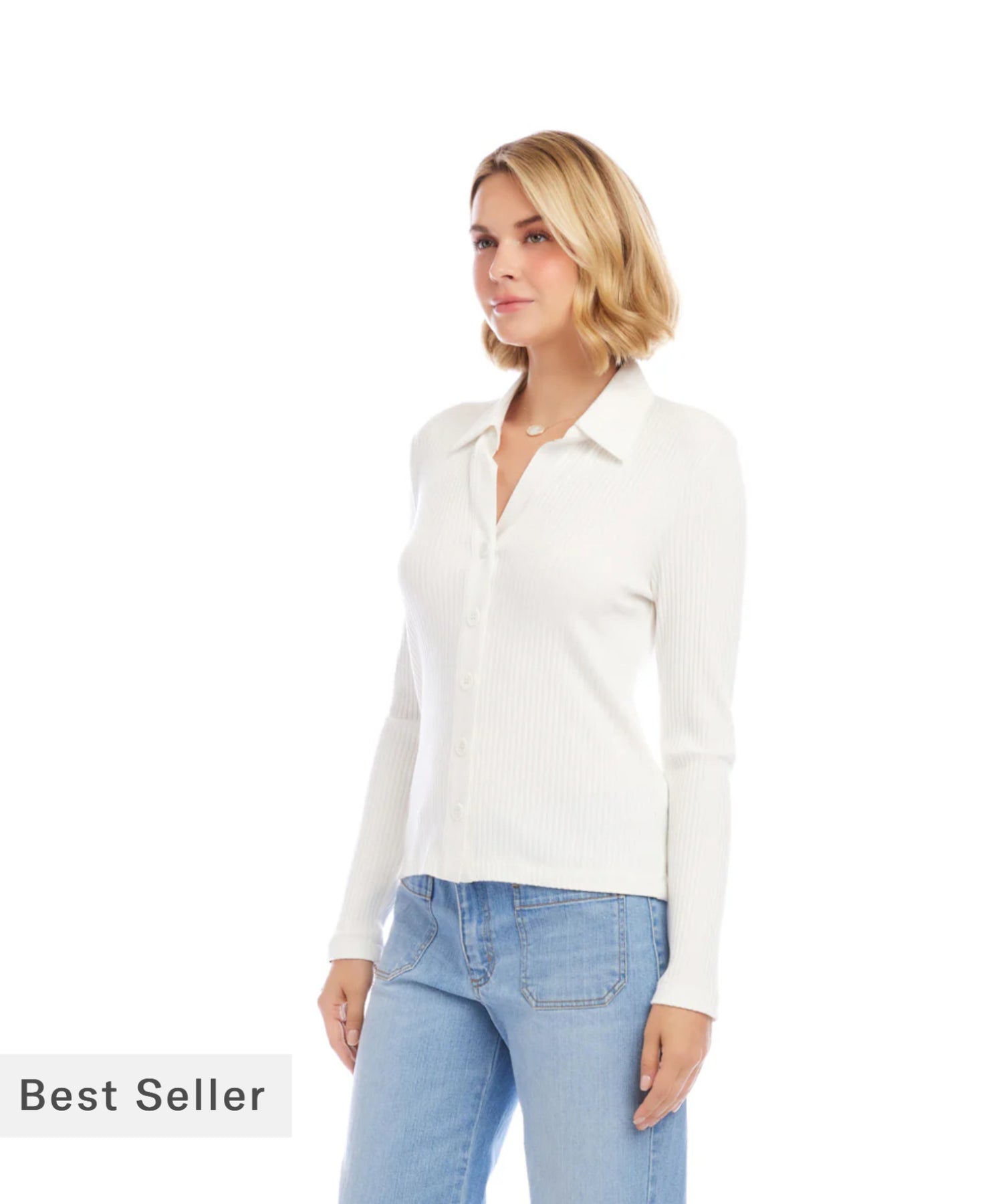 This ribbed long-sleeve top features a contrast shirt collar, full button-front closure, and a sleek, stretchy knit that creates a smooth, refined silhouette—perfect worn alone or layered.