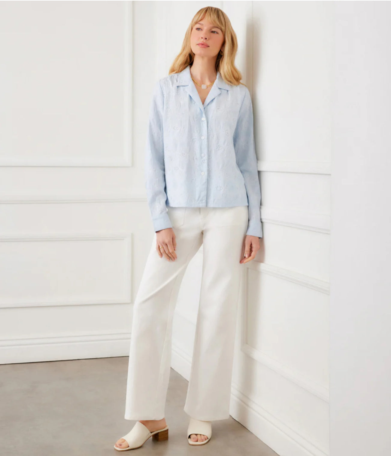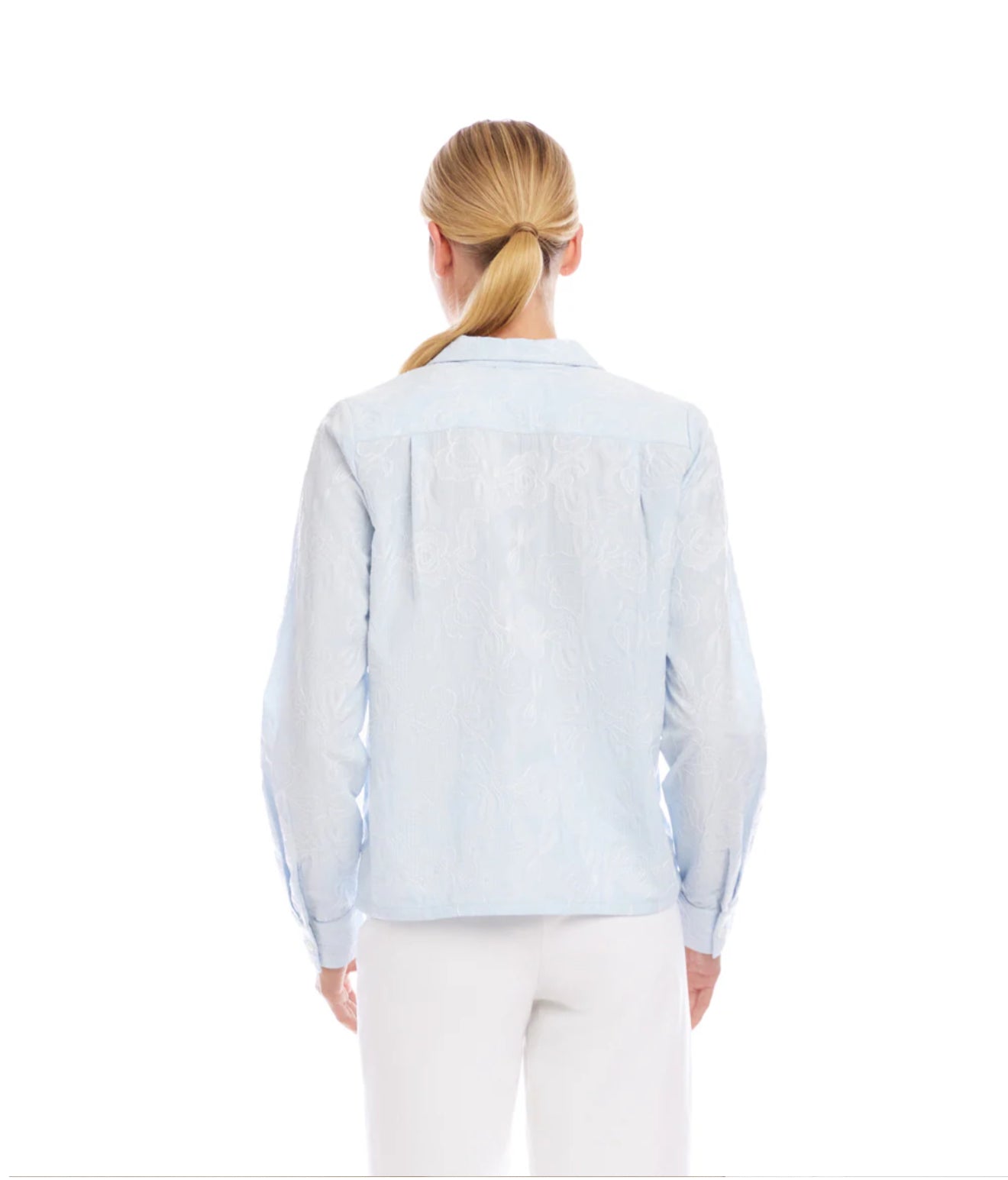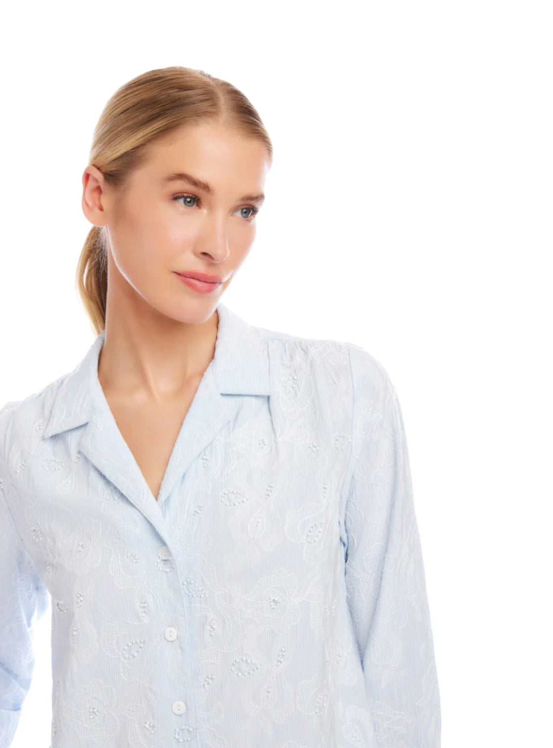 A refined button-up shirt crafted in yarn-dyed stripe woven fabric with delicate embellishment details throughout. Designed with a classic collar, long sleeves, and a relaxed yet polished fit for effortless everyday styling.
