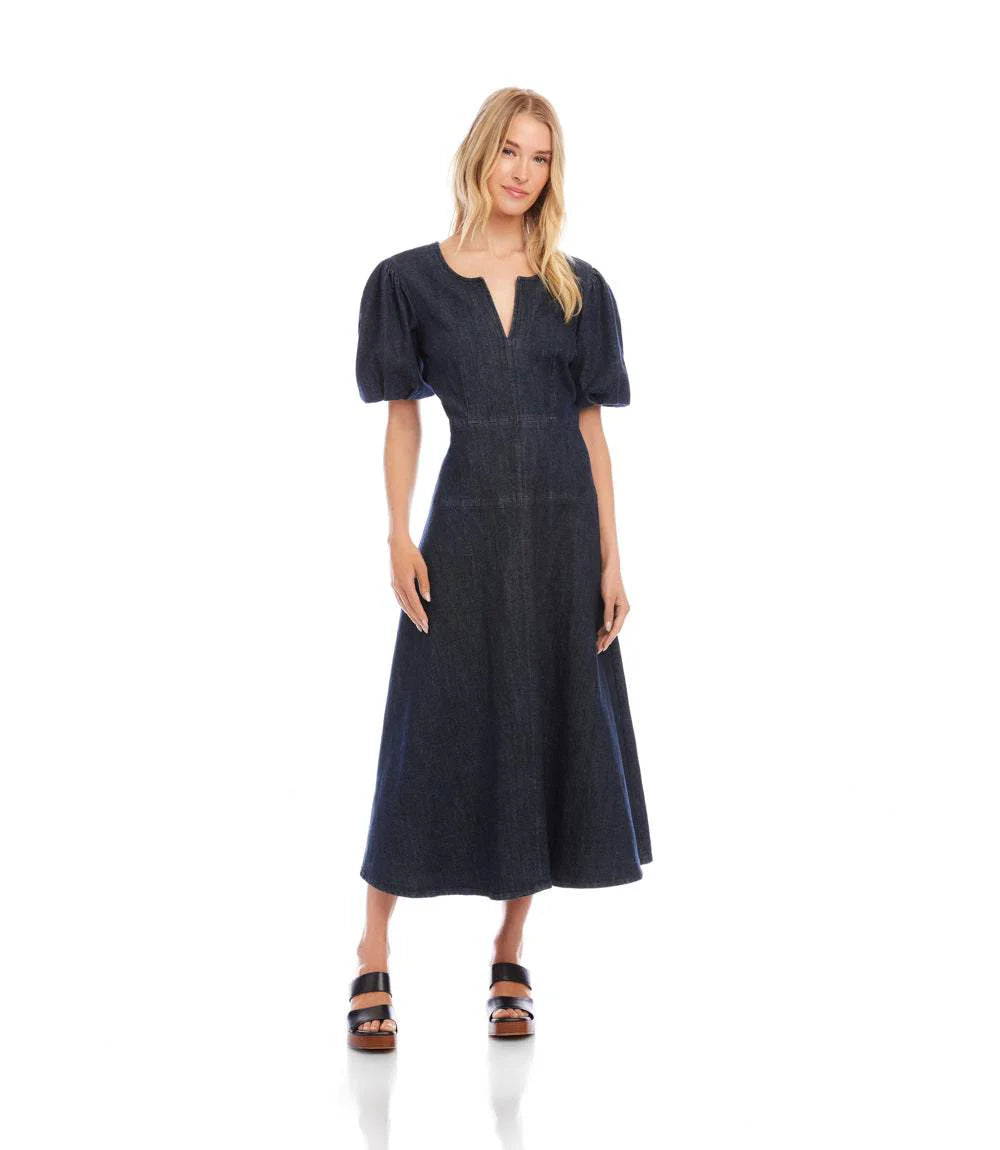 - Fitted through the bust with a defined waist and easy A-line skirt. Midi length with voluminous puff sleeves.