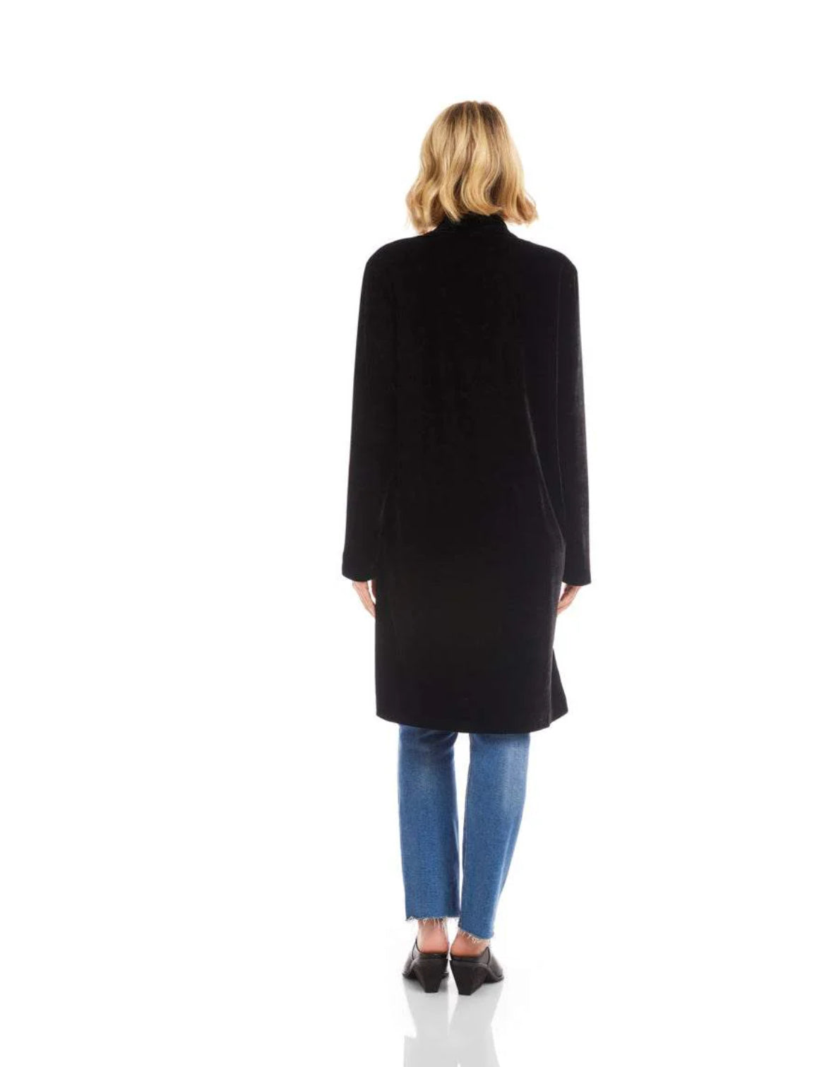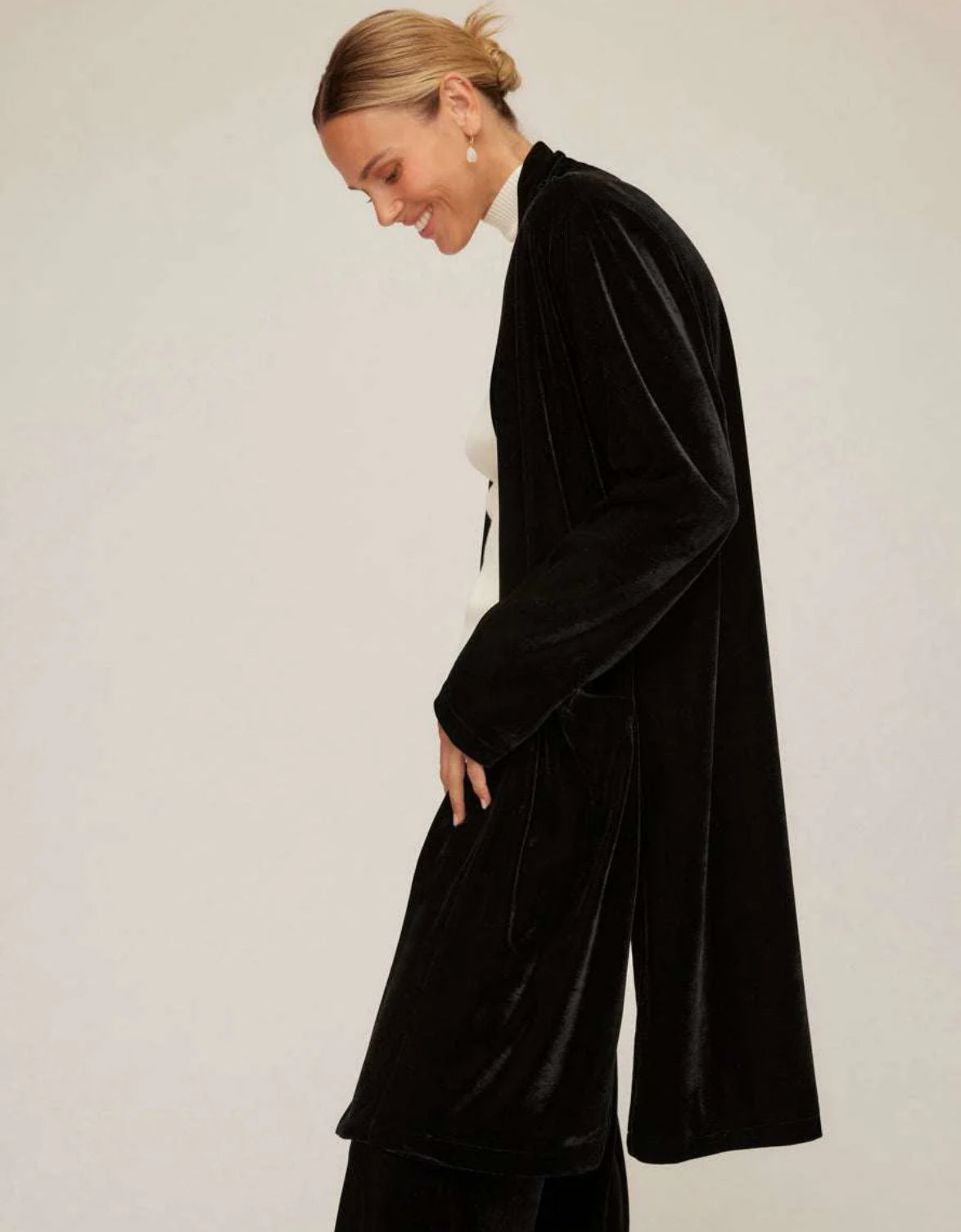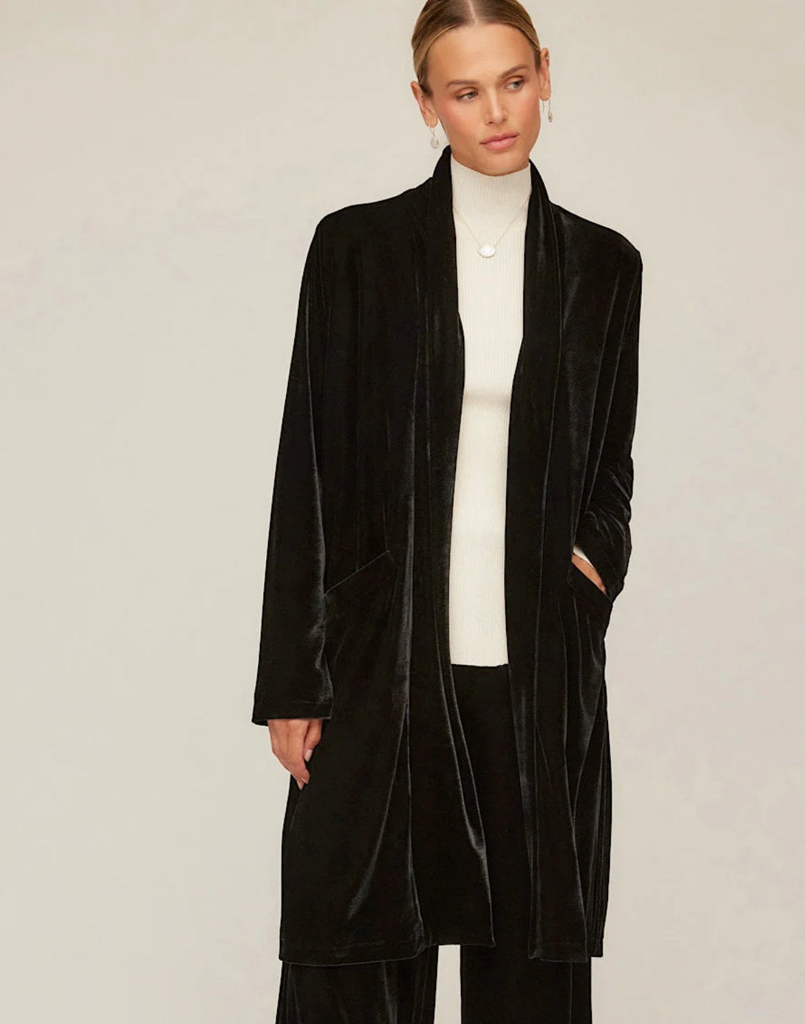A luxurious layering piece with timeless elegance. Crafted from stretch velvet, this duster features a long-sleeve, open-front design that slips on effortlessly. Set-in sleeves and side slits add to the sleek silhouette, while two front pockets provide both function and style.