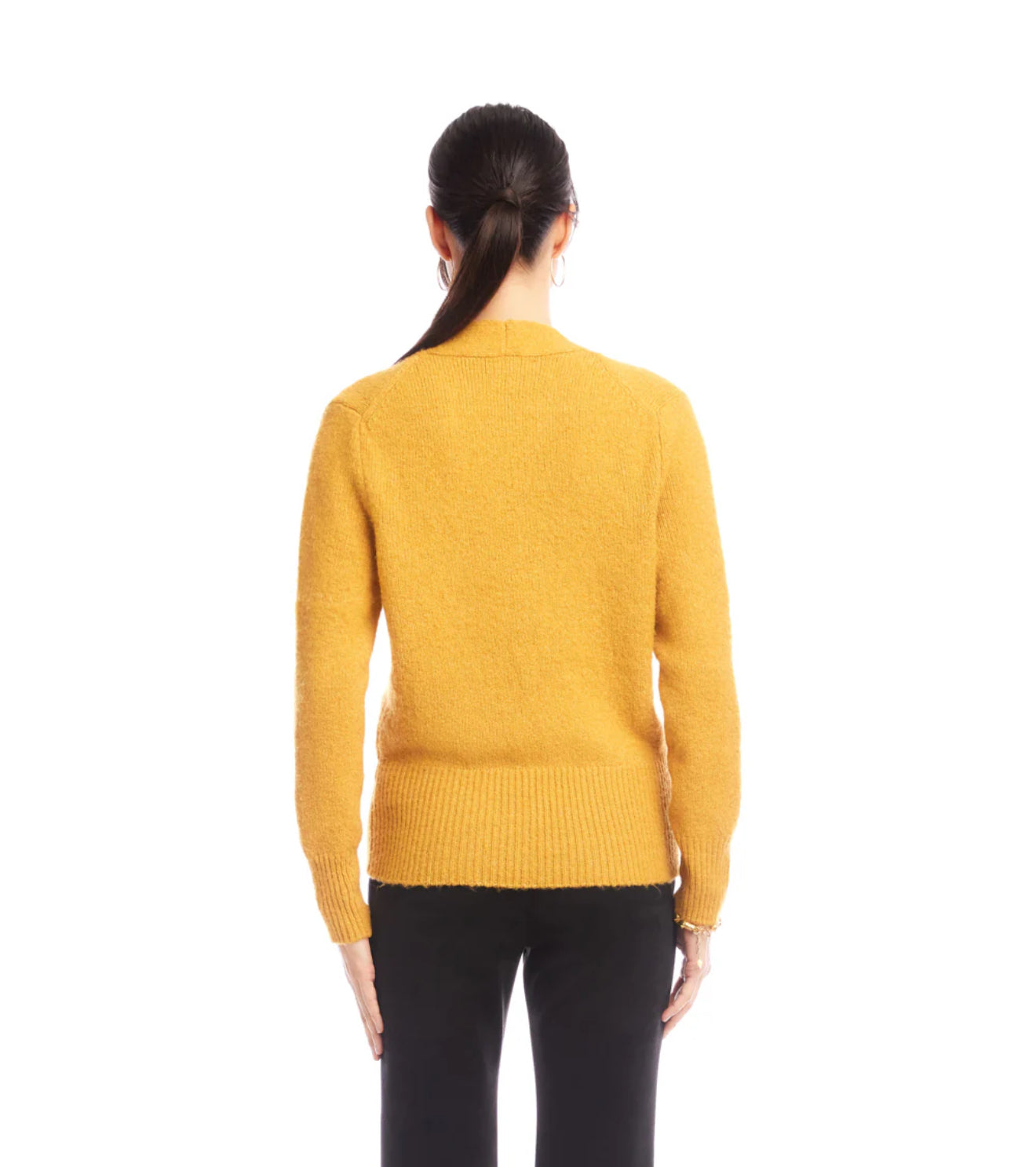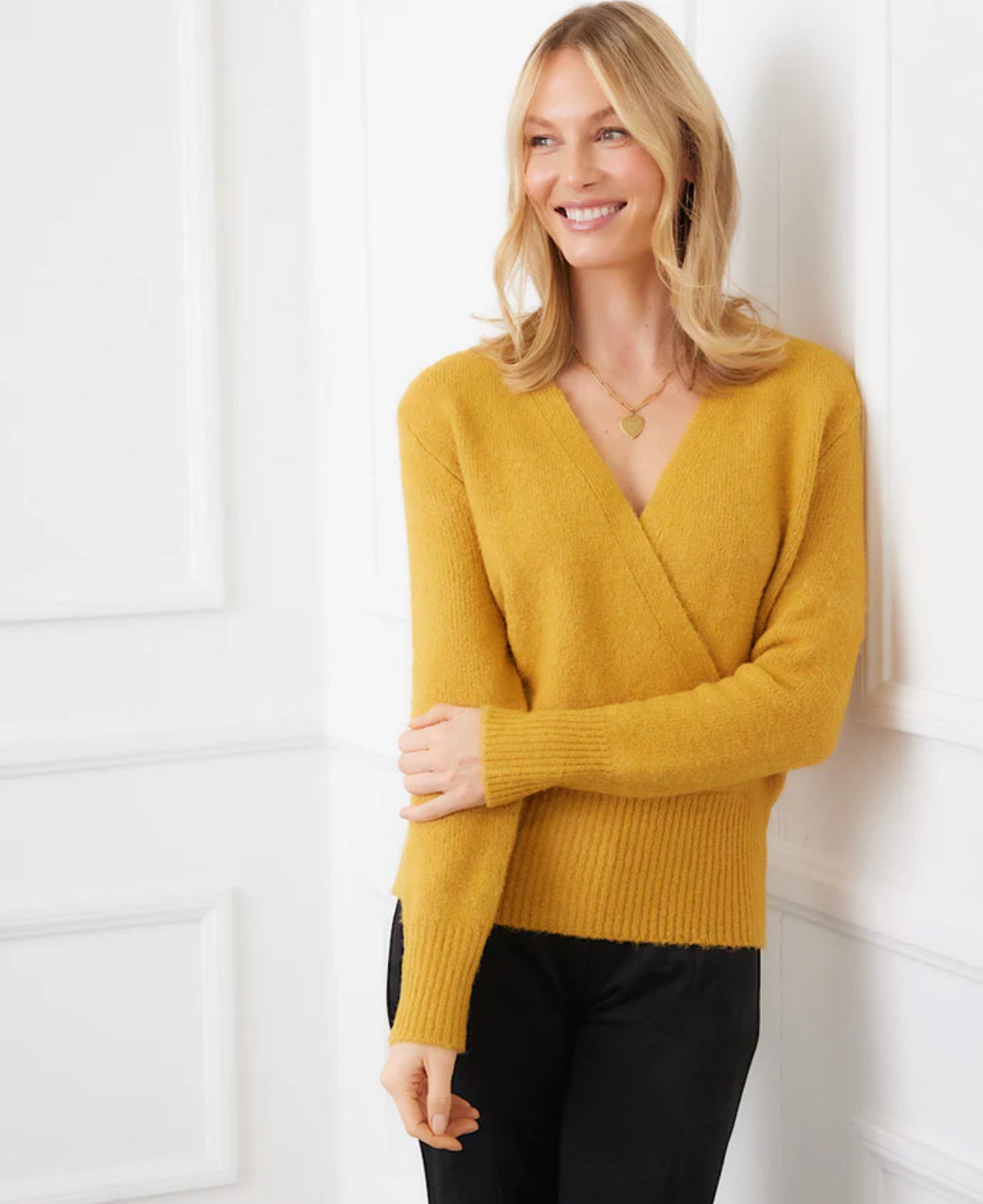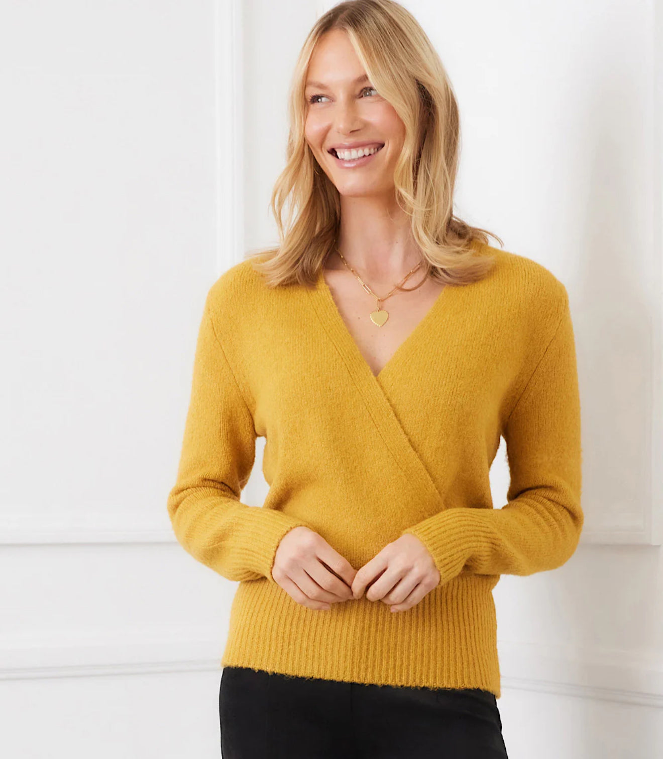 A timeless essential with a cozy twist, this pull-on sweater features a faux wrap design with a flattering crossover V-neckline, long sleeves, and subtle drop shoulders for a relaxed yet refined look. Wide ribbed edge detailing at the hem and cuffs adds texture and structure for an elevated finish.