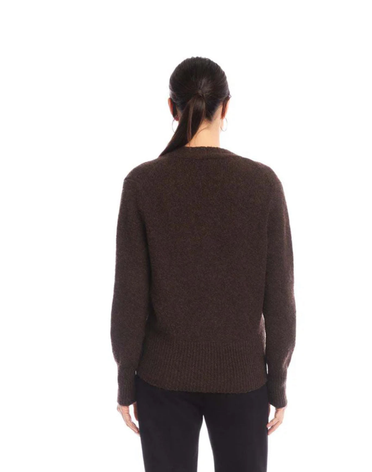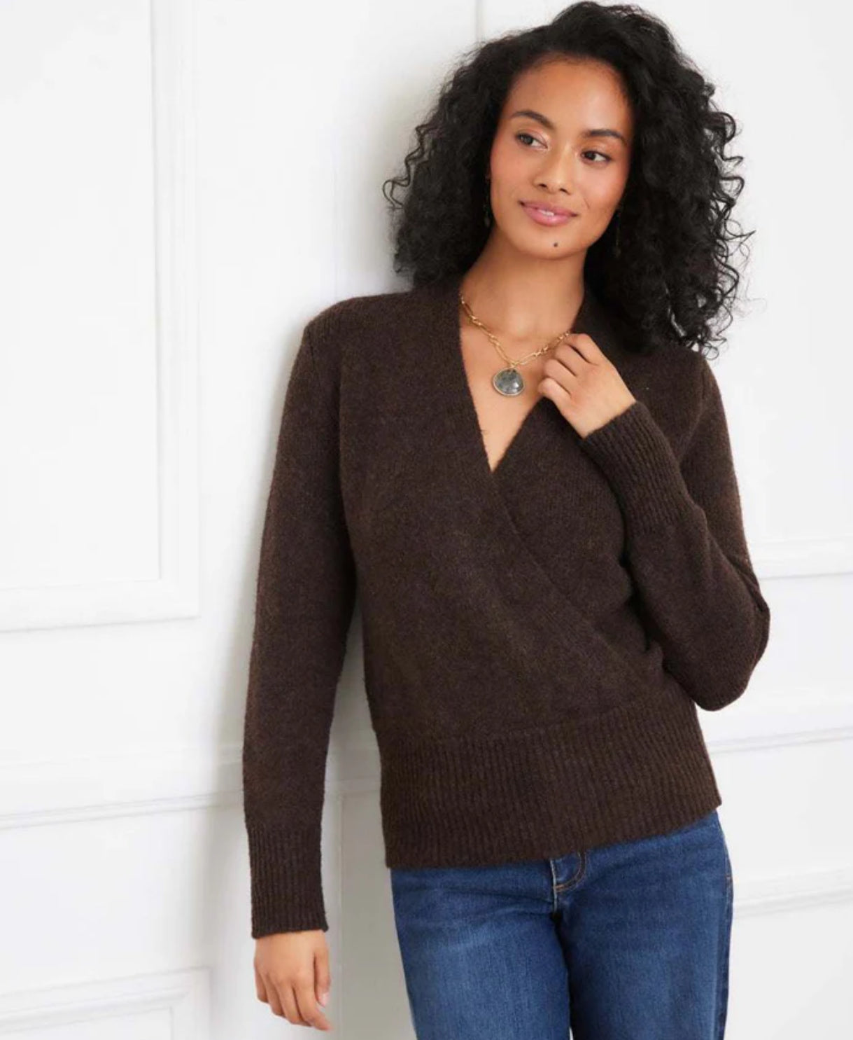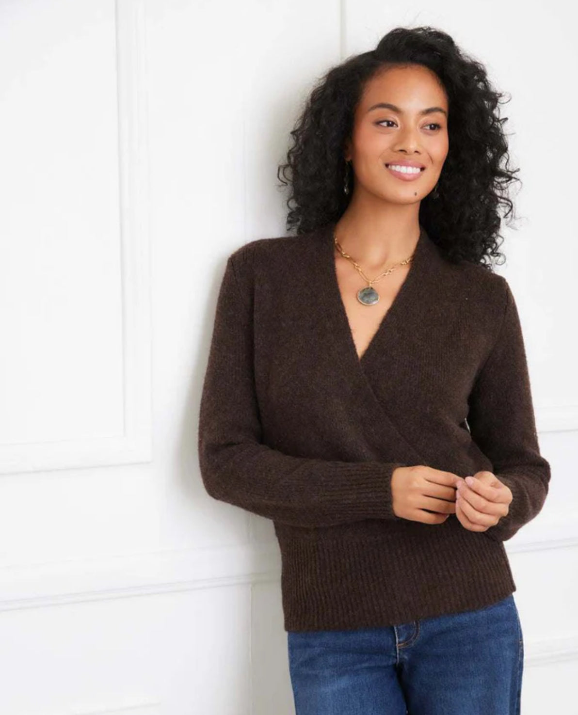 A timeless essential with a cozy twist, this pull-on sweater features a faux wrap design with a flattering crossover V-neckline, long sleeves, and subtle drop shoulders for a relaxed yet refined look. Wide ribbed edge detailing at the hem and cuffs adds texture and structure for an elevated finish.